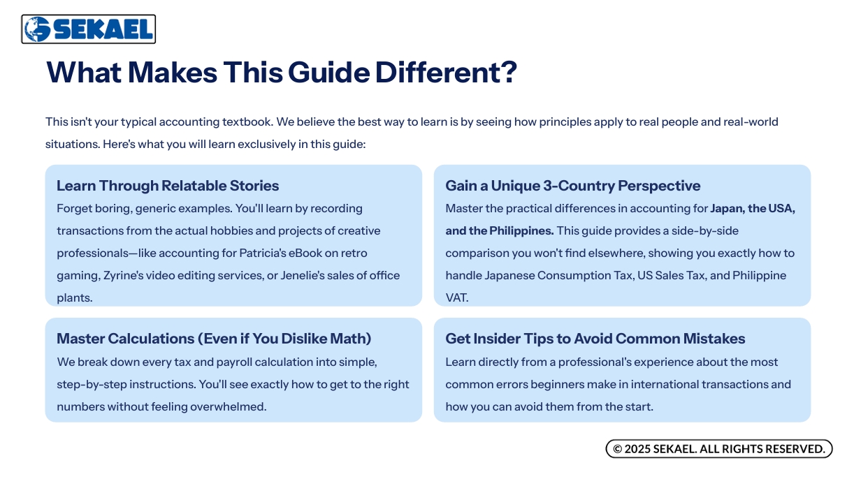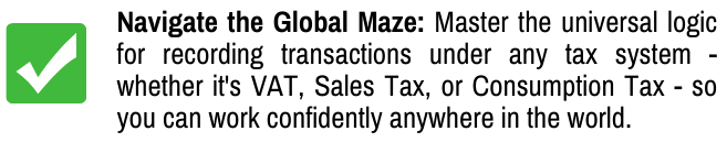 Yes! We provide a global snapshot. You will learn specific rules for recording VAT in the Philippines, Consumption Tax in Japan, and Sales Tax in the US.