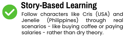 We break down complex concepts into simple stories. You’ll learn by following real people – like Jenelie selling plants in the Philippines or Patricia writing eBooks in Japan – rather than memorizing abstract rules.