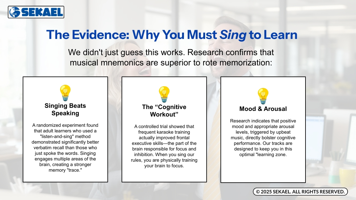 Research confirms that “musical mnemonics” are superior to rote memorization. Singing engages multiple areas of the brain, creating a stronger memory trace so you won’t forget the logic of forecasting.